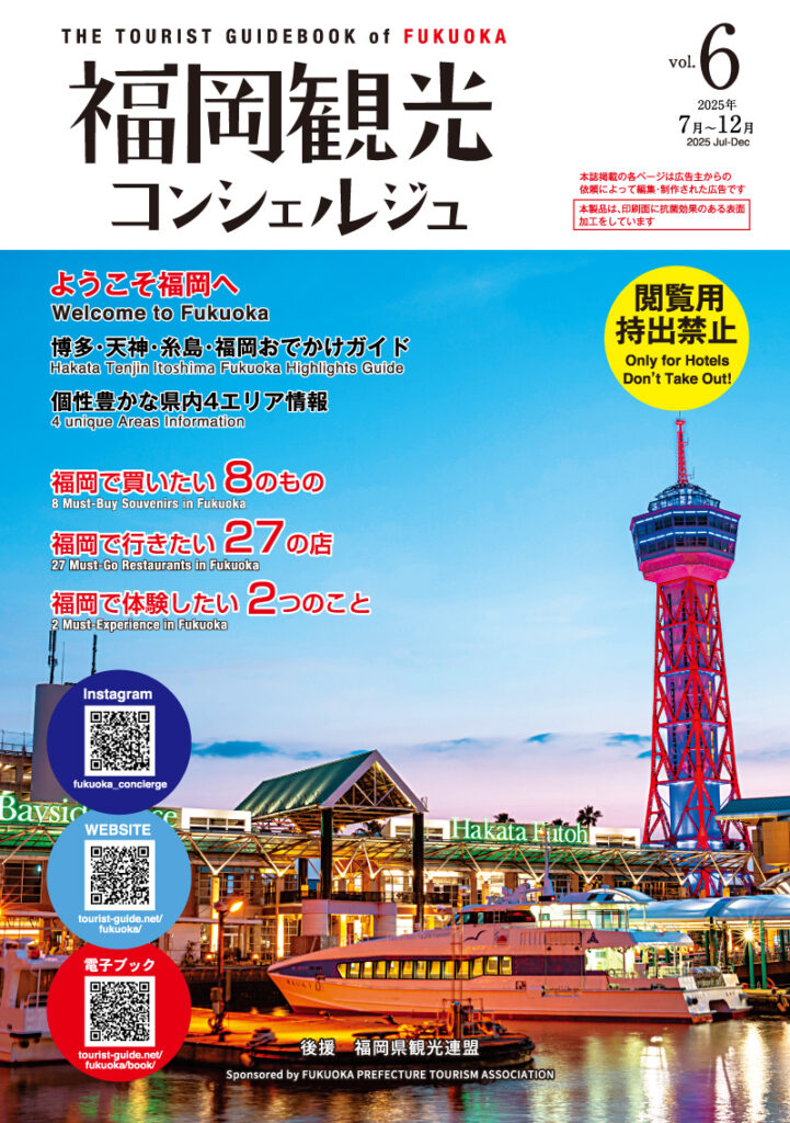 福岡観光コンシェルジュは福岡のホテル・旅館などの客室に設置されている、これまでにない福岡の観光情報誌。観光やビジネスで福岡に来られた方が、ホテルや旅館の部屋で読む、新しいスタイルの雑誌です。