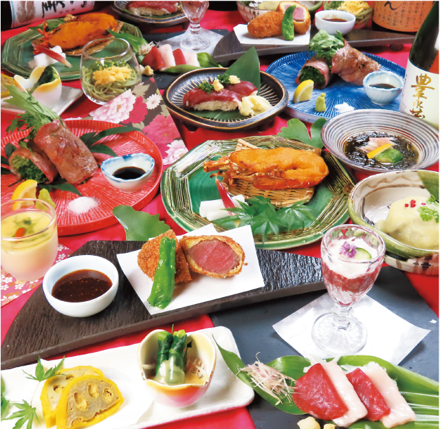 コースは6,600円から(2名以上で要予約)。馬刺しやあか牛、黒毛和牛のステーキなど郷土料理を味わえるコースも評判