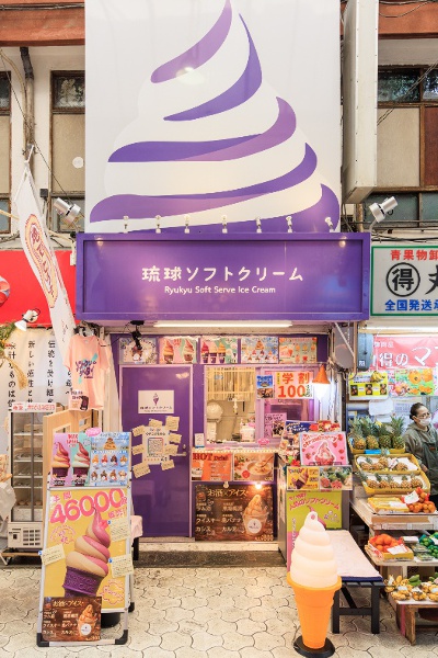 国際通りから牧志公設市場へ続く市場本通りに店を構えるソフトクリーム店。看板メニューの紅芋×黒糖MIXは、年間約46,000本を売り上げた人気No.1フレーバー。