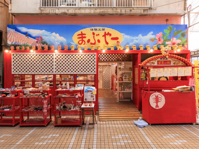 レトロなアーケード街の中の工房は、国際通りから徒歩5分、壺屋やちむん通りから徒歩1分という絶好のロケーション。人気のシーサー絵付け体験では、大小さまざまなシーサーや魔よけの「石敢當(いしがんとう)」など、約25種類の中から好きな1体を選択。自分で配色を工夫したりお気に入りのキャラクターに見立てたりと、楽しみ方は十人十色だ。絵に自信のない人には、サンゴの土台にシーサーや星砂を飾る「さんごシーサー」づくりもおすすめ。子どもも大人も夢中になれる体験は、忘れられない旅の思い出になるはずだ。
