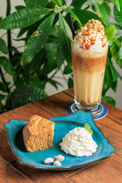 沖縄産の黒糖、紅芋、蜂蜜、卵を使い、20層以上丁寧に焼き重ねたオリジナルバウムクーヘンをはじめ、ボリューム満点のカフェメニューが揃い、夜にはアルコールも楽しめる。アメリカンビレッジ散策の合間にほっと一息つくのにぴったり。